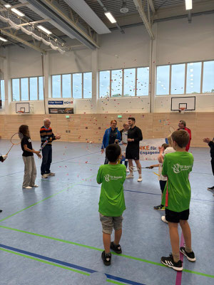 Die Ehrung fand direkt vor dem Jugendtraining in der RBG-Halle Burgdorf statt – als gelungene Überraschung, eingebettet in eine besondere Atmosphäre. Rund 40 Mitglieder der Abteilung, darunter zahlreiche Kinder und Jugendliche, hatten sich versammelt, um Devin gemeinsam zu feiern. Als besonderen Moment bildeten die Kinder ein Spalier mit hochgehaltenen Badmintonschlägern, durch das Devin sichtlich gerührt in die Halle geführt wurde.